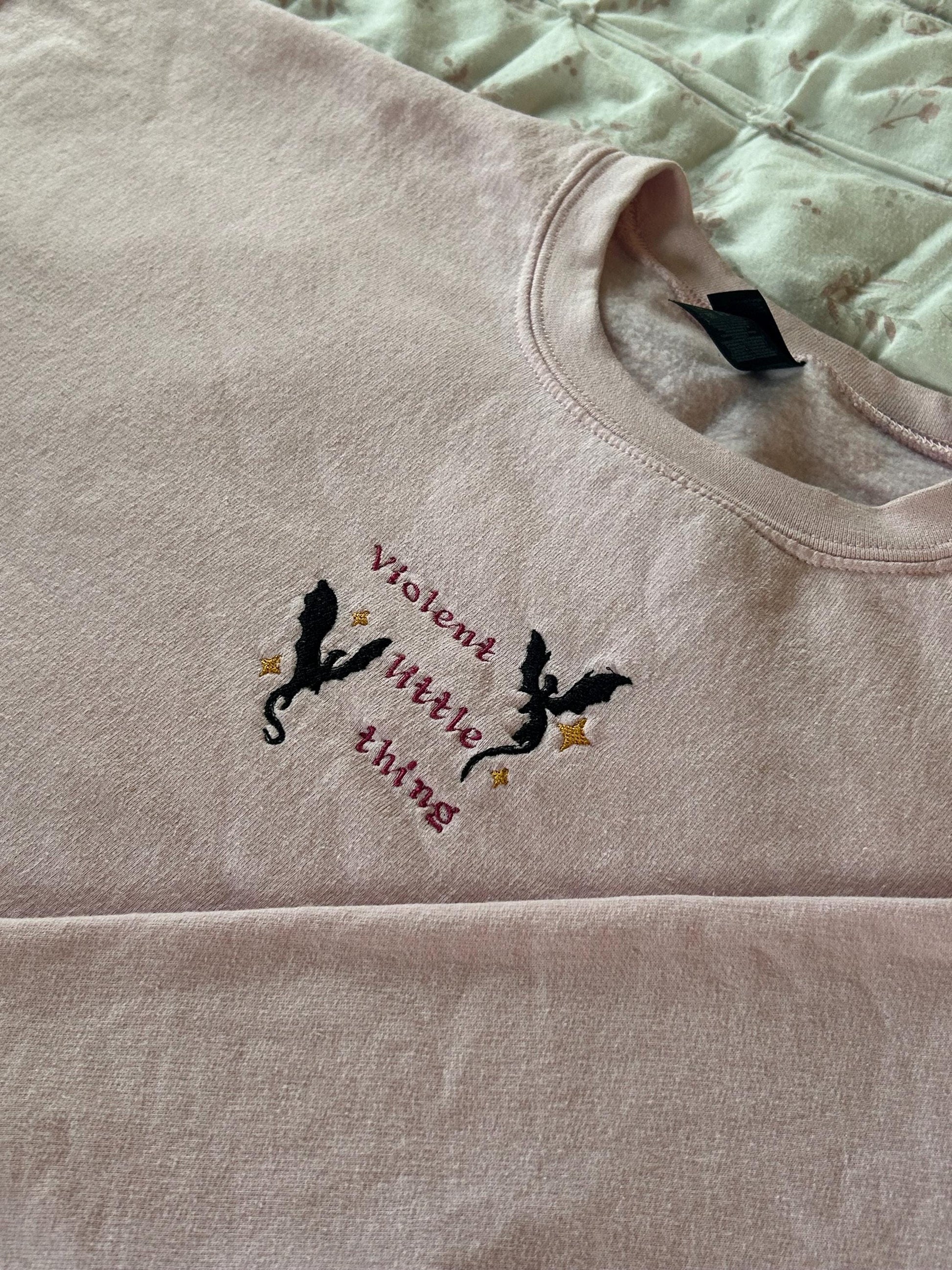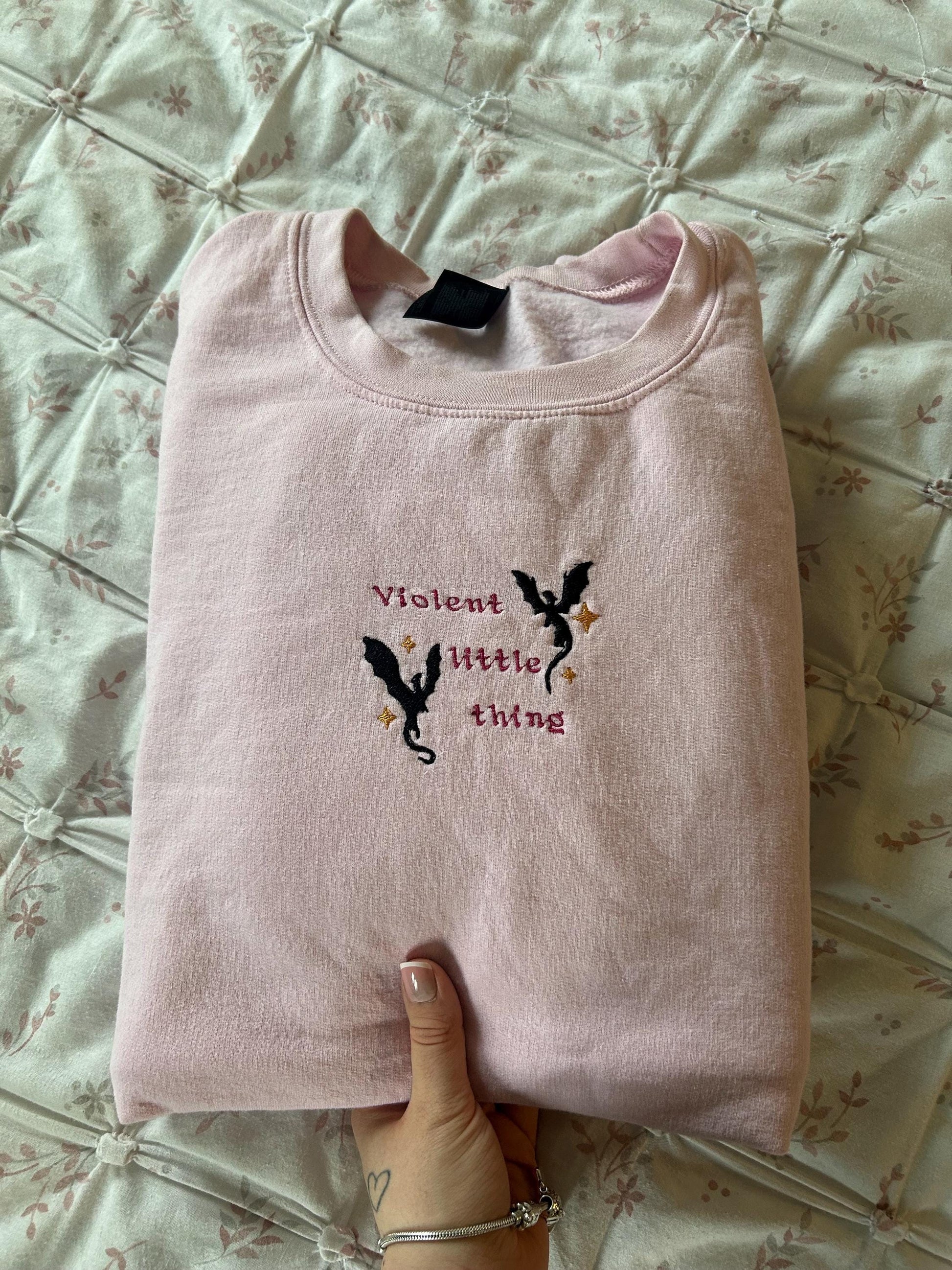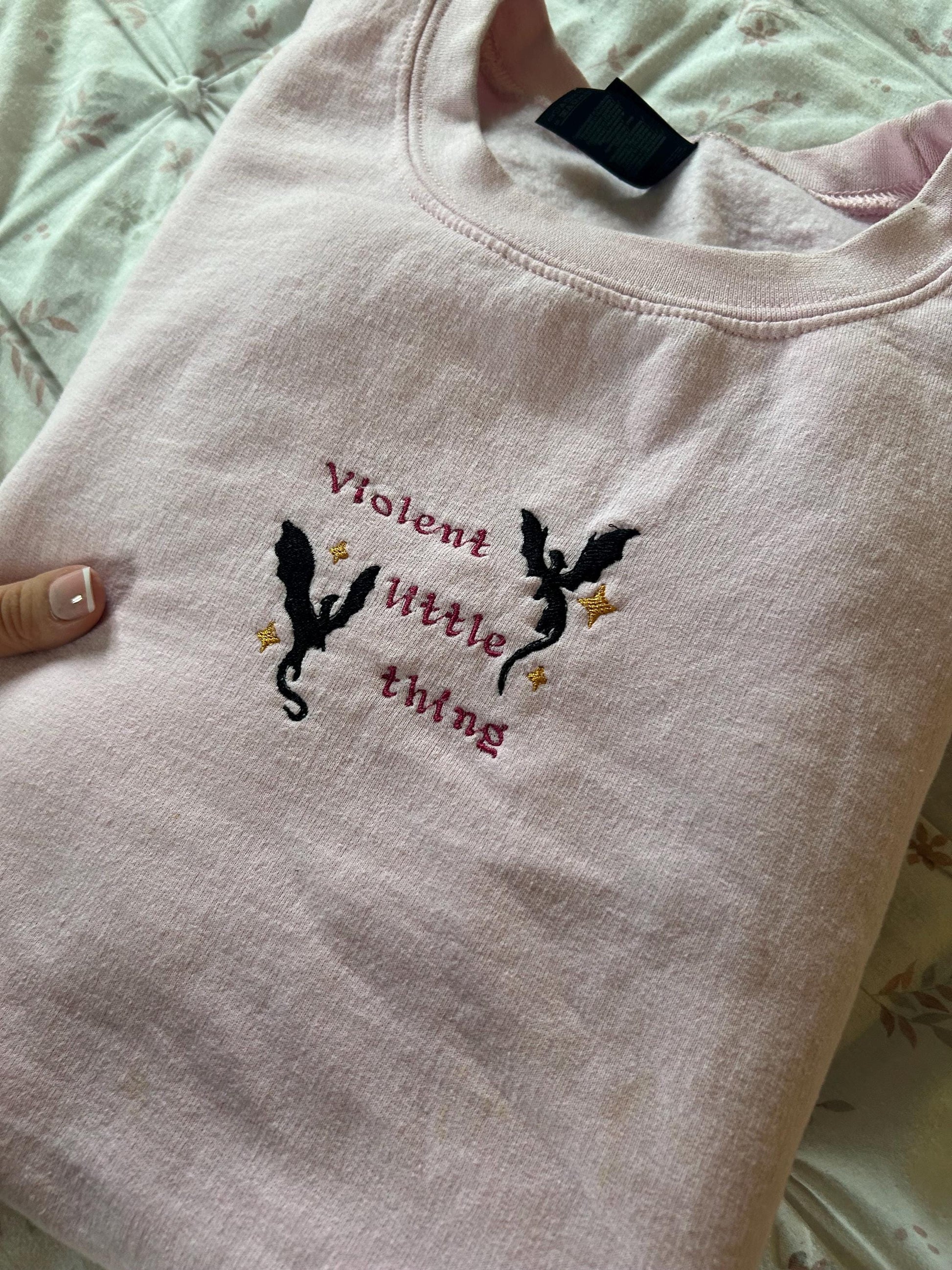 Embroidered Pink Sweatshirt with hand crafted design, perfect for readers.