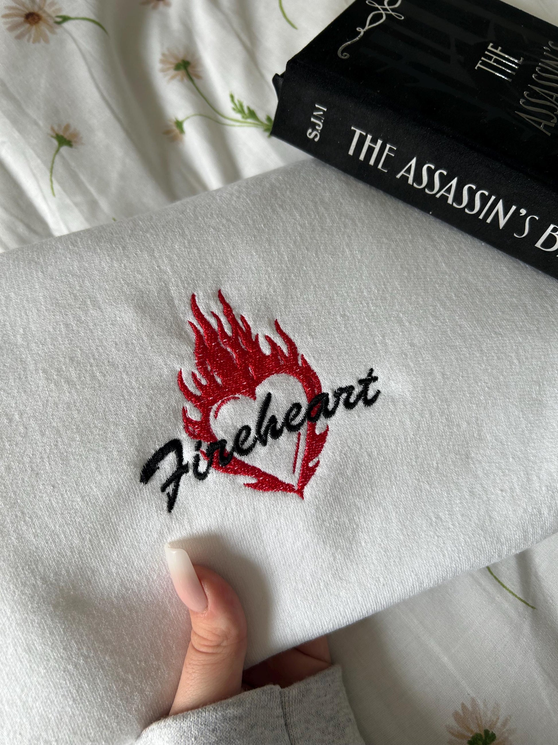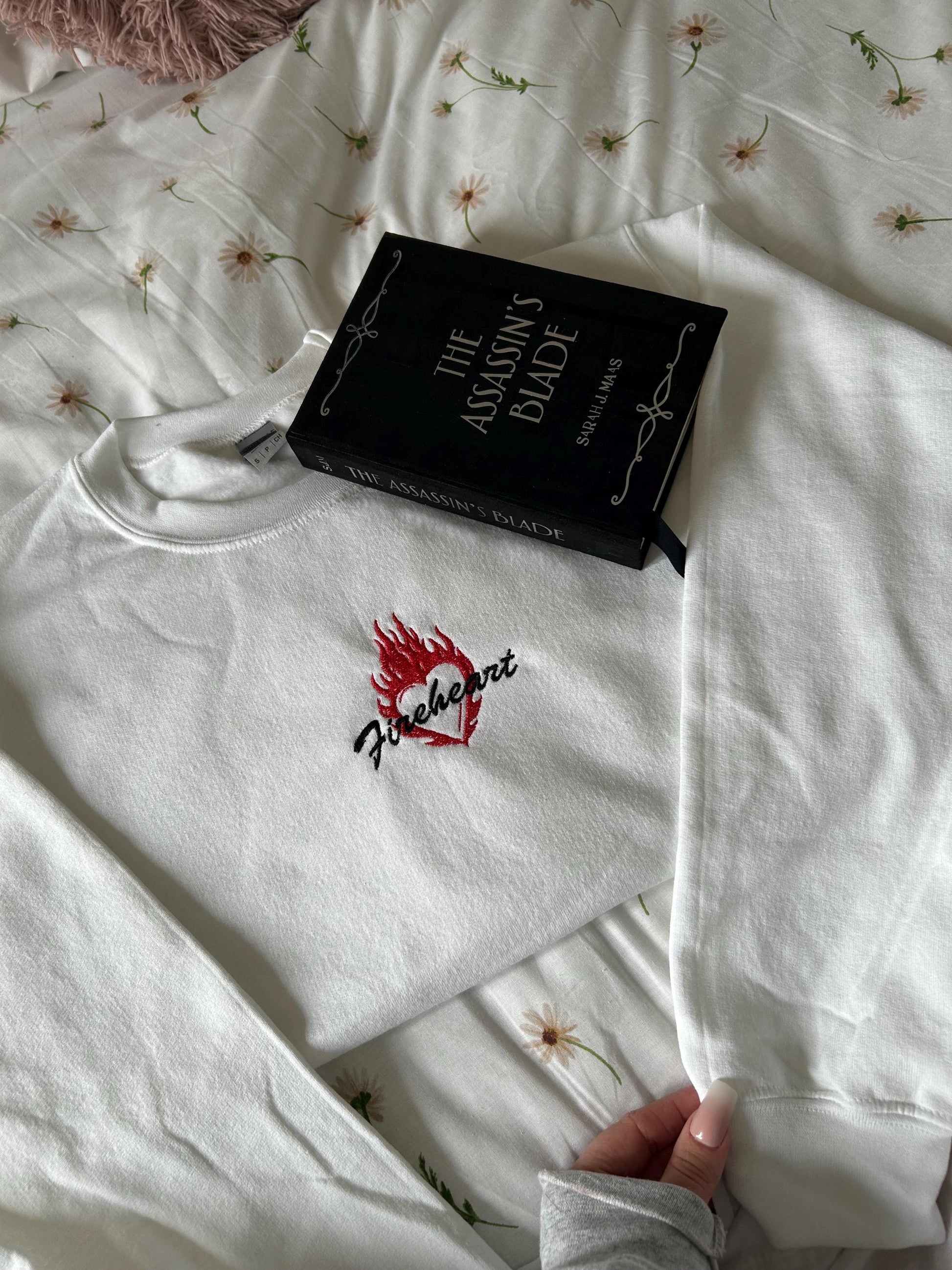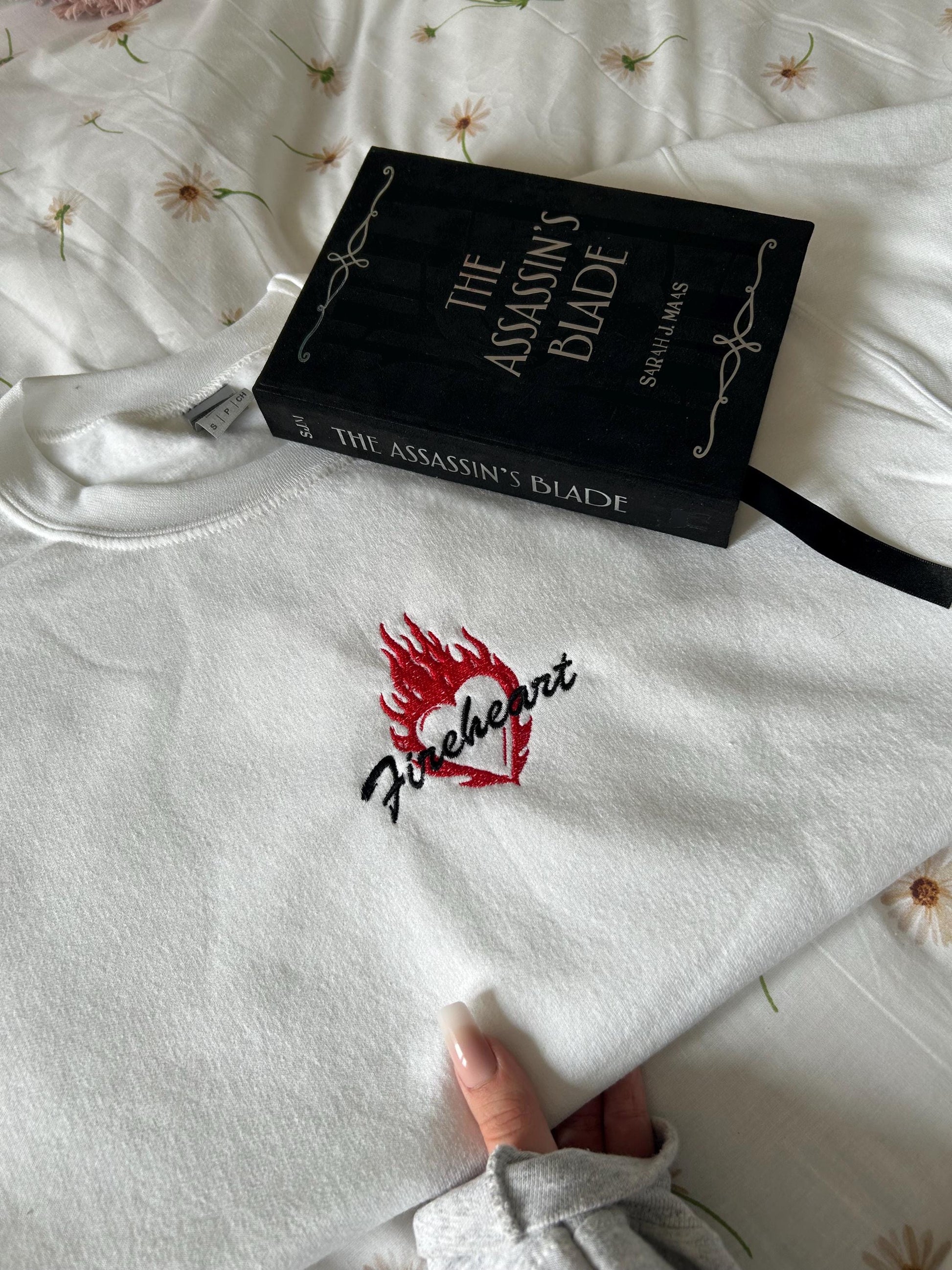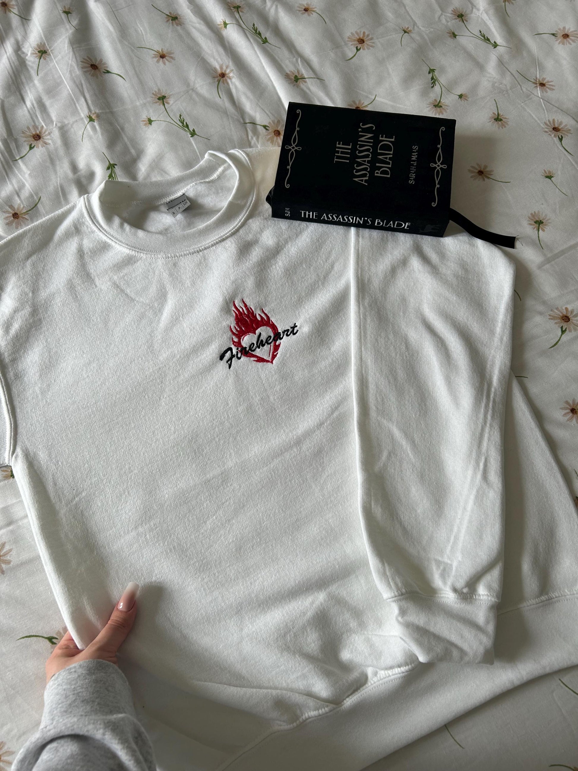 Embroidered White Sweatshirt with hand crafted design, perfect for readers.