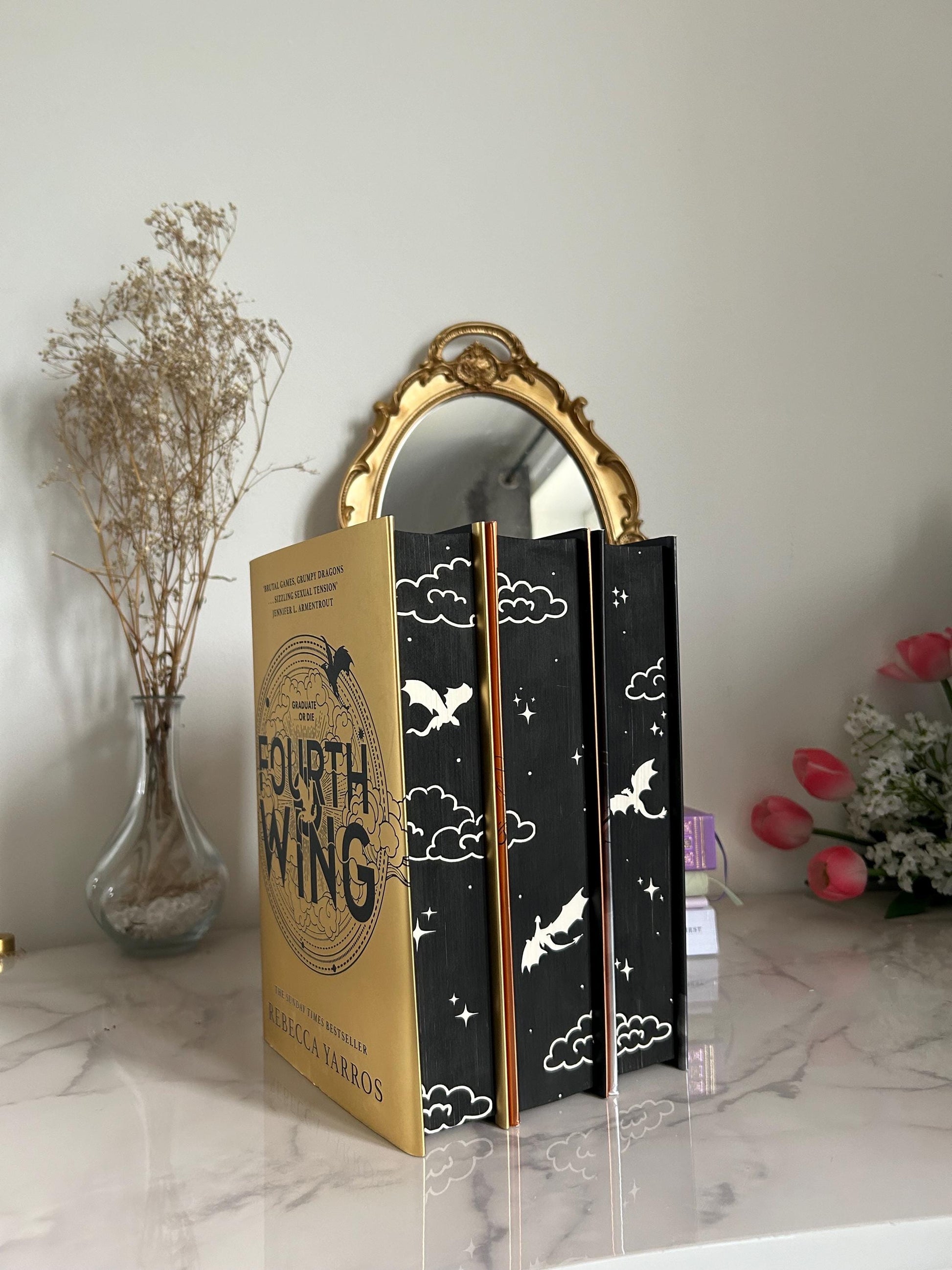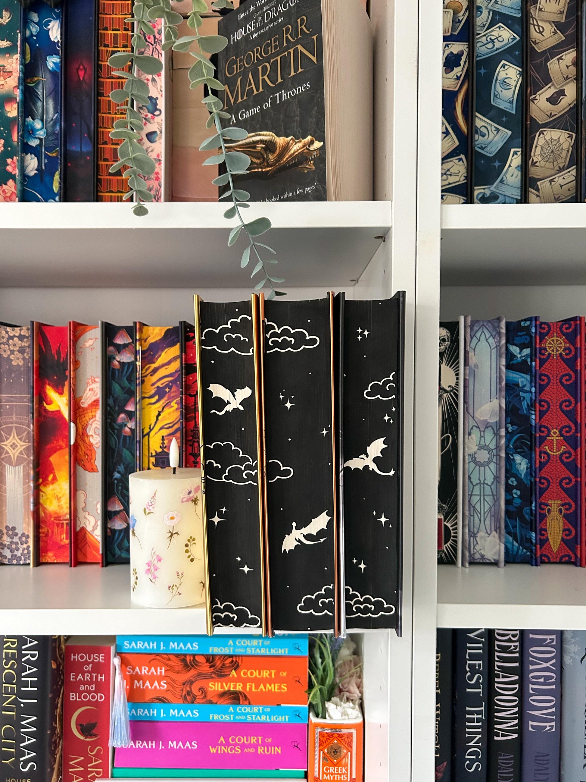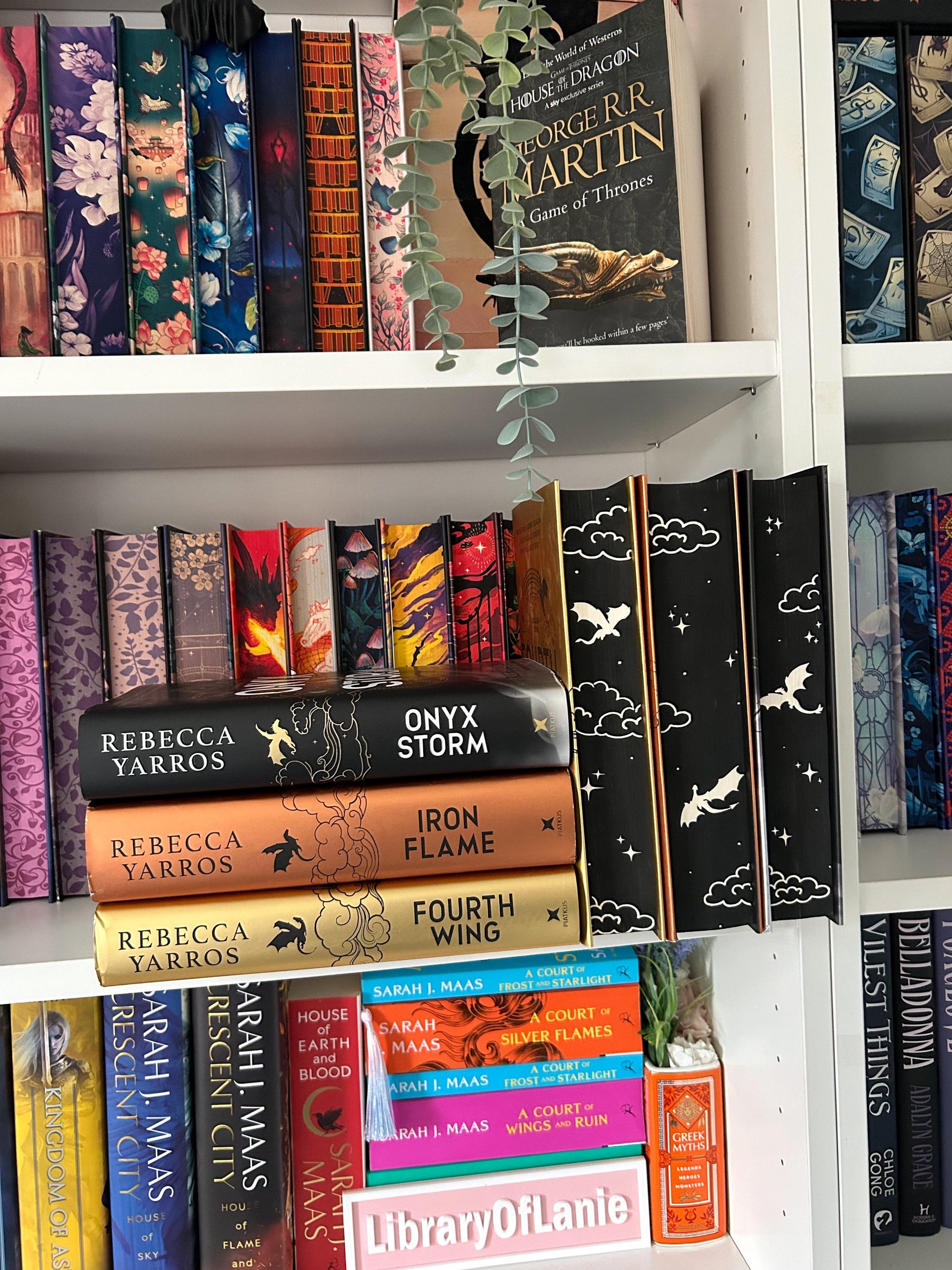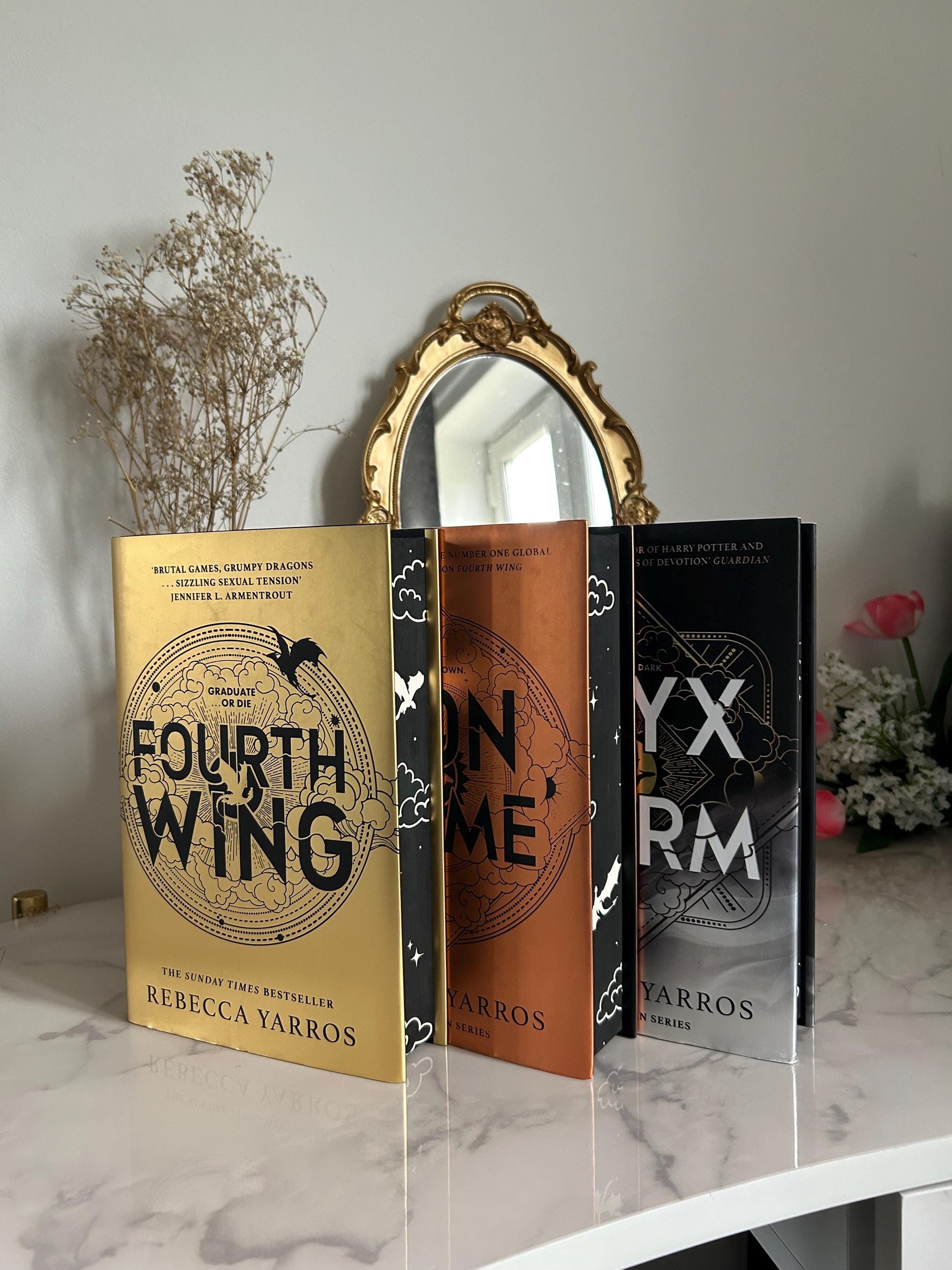 Gorgeous UK hardback set of Fourth Wing, Iron Flame and Onyx Storm with a design that carries across all book edges.