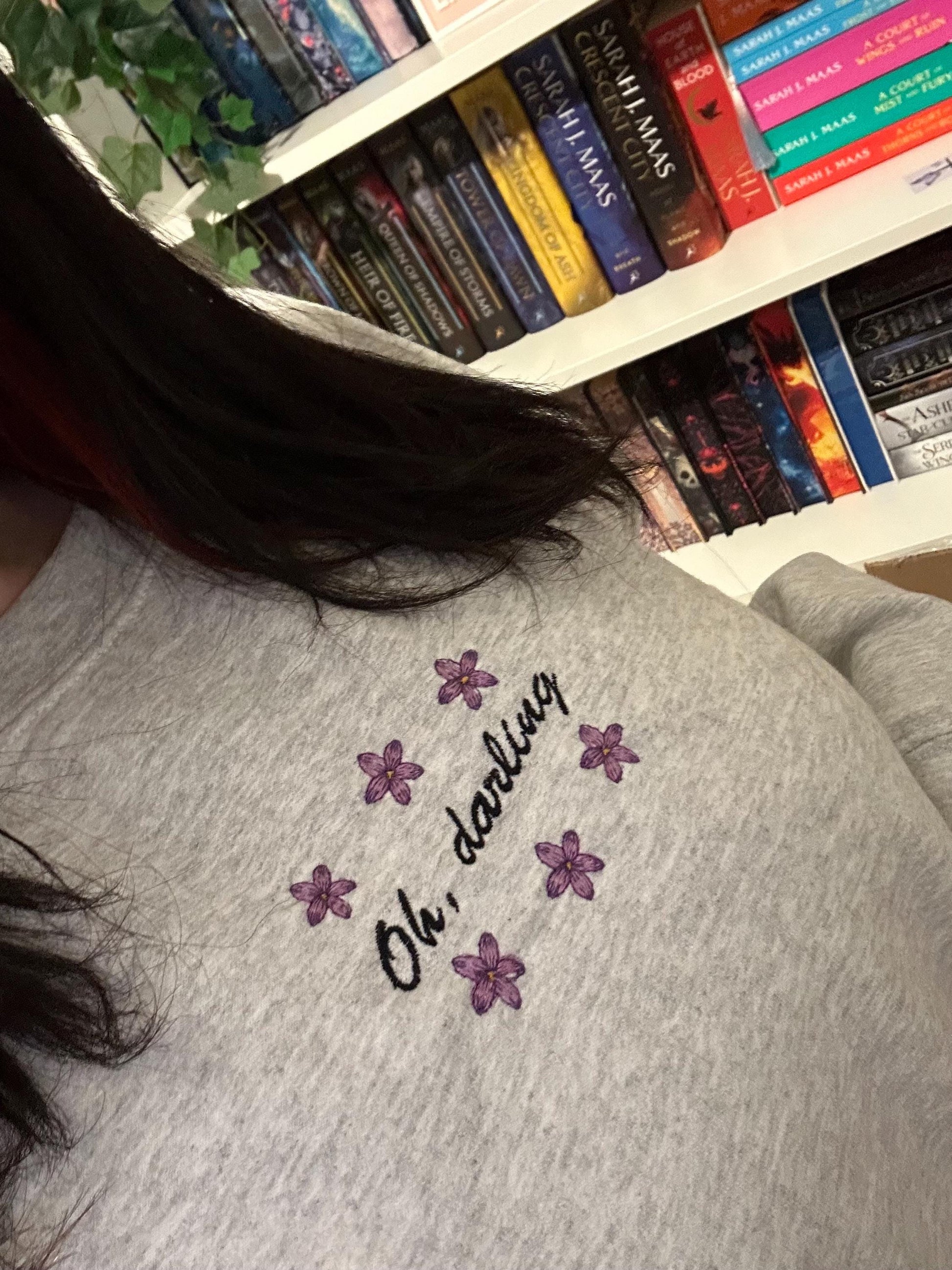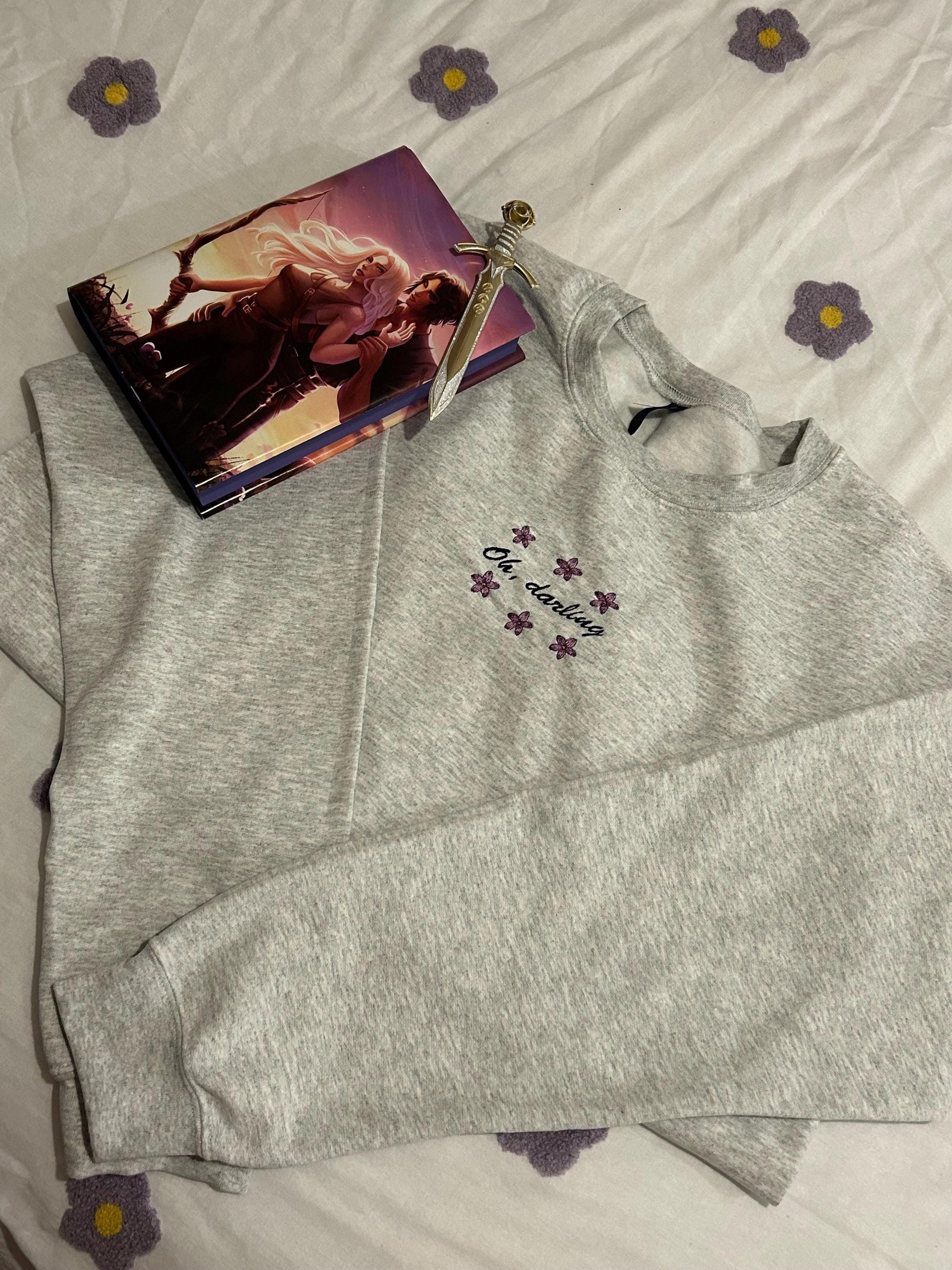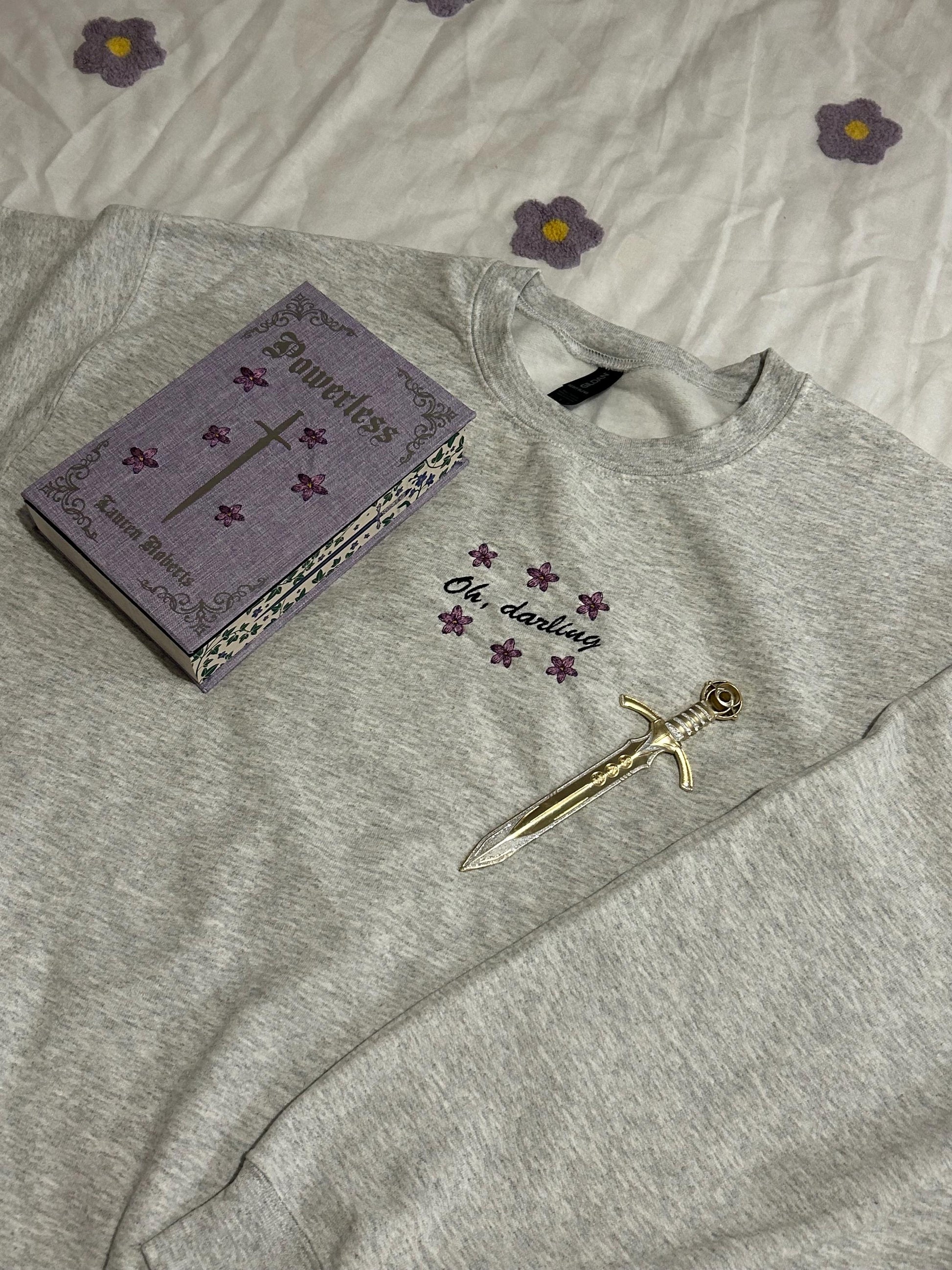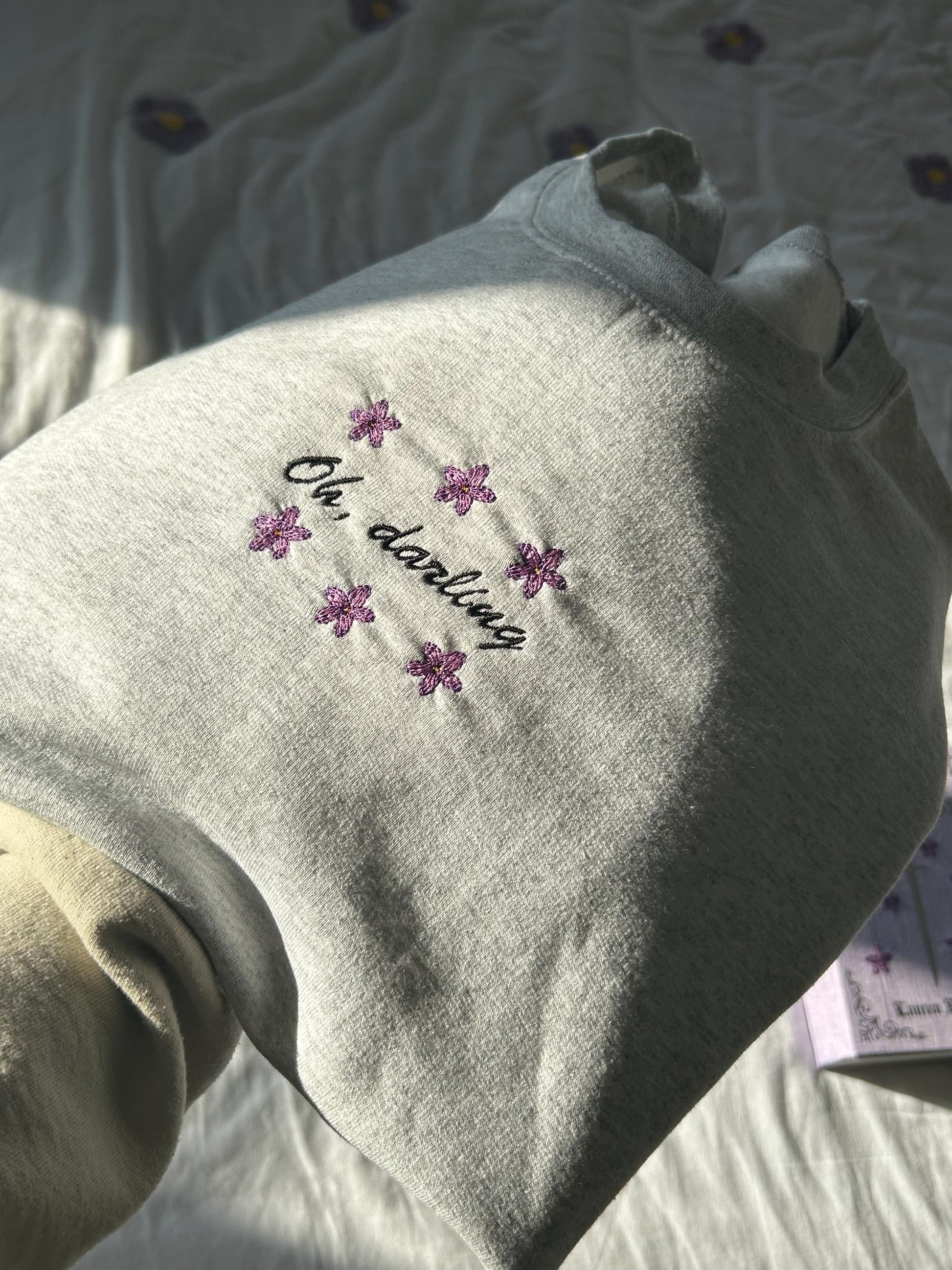 Embroidered Grey Sweatshirt with hand crafted design, perfect for readers.