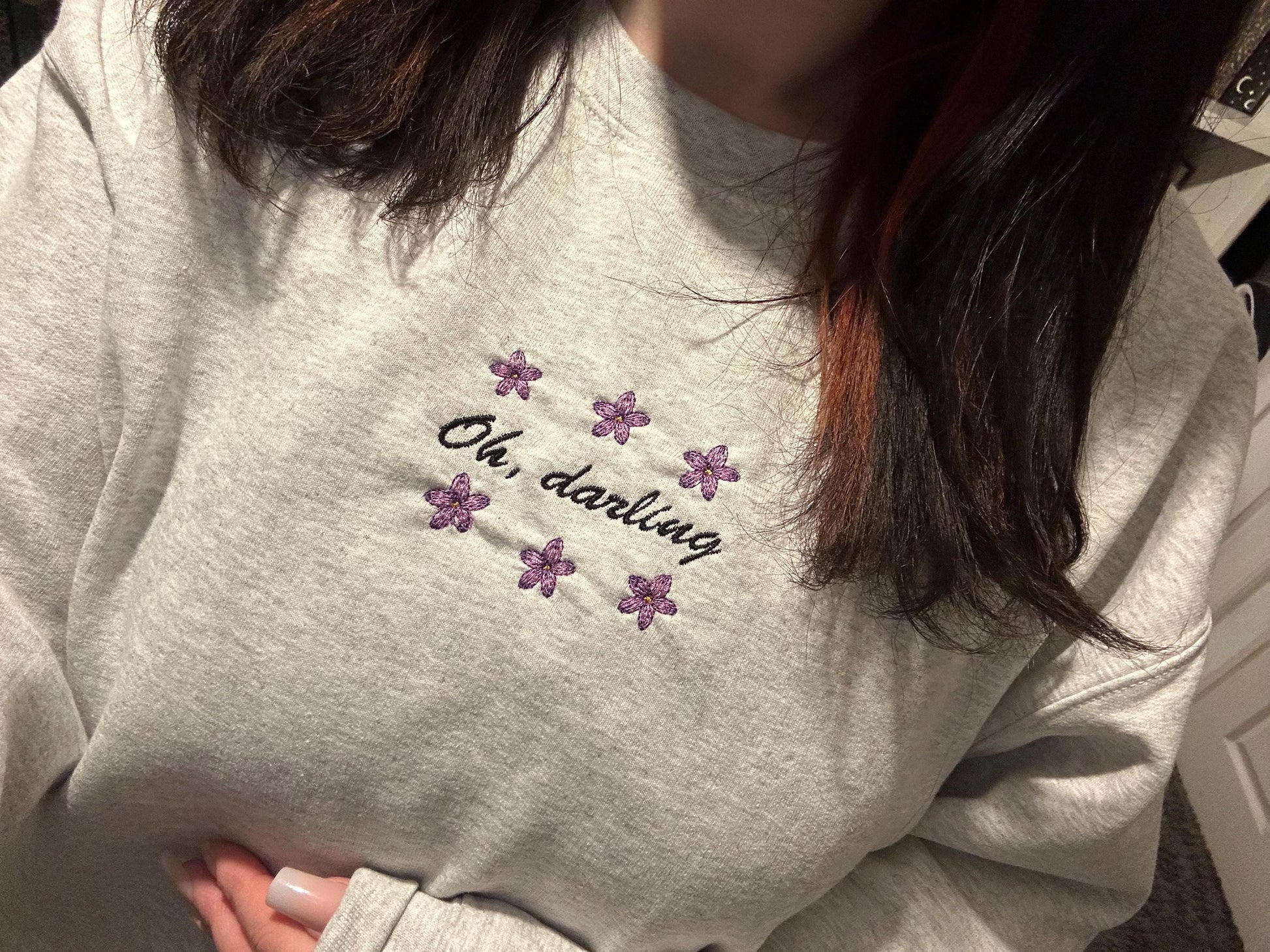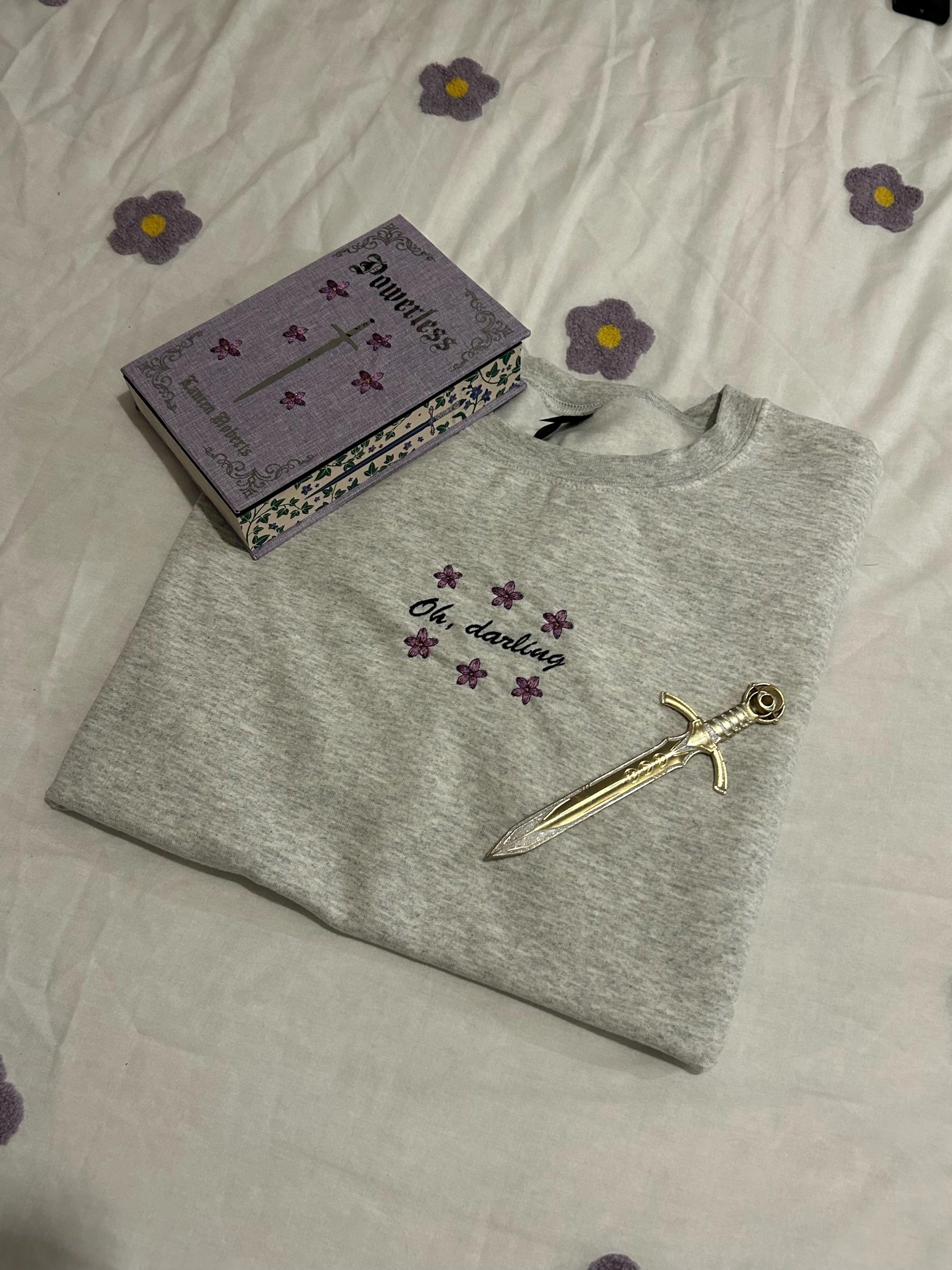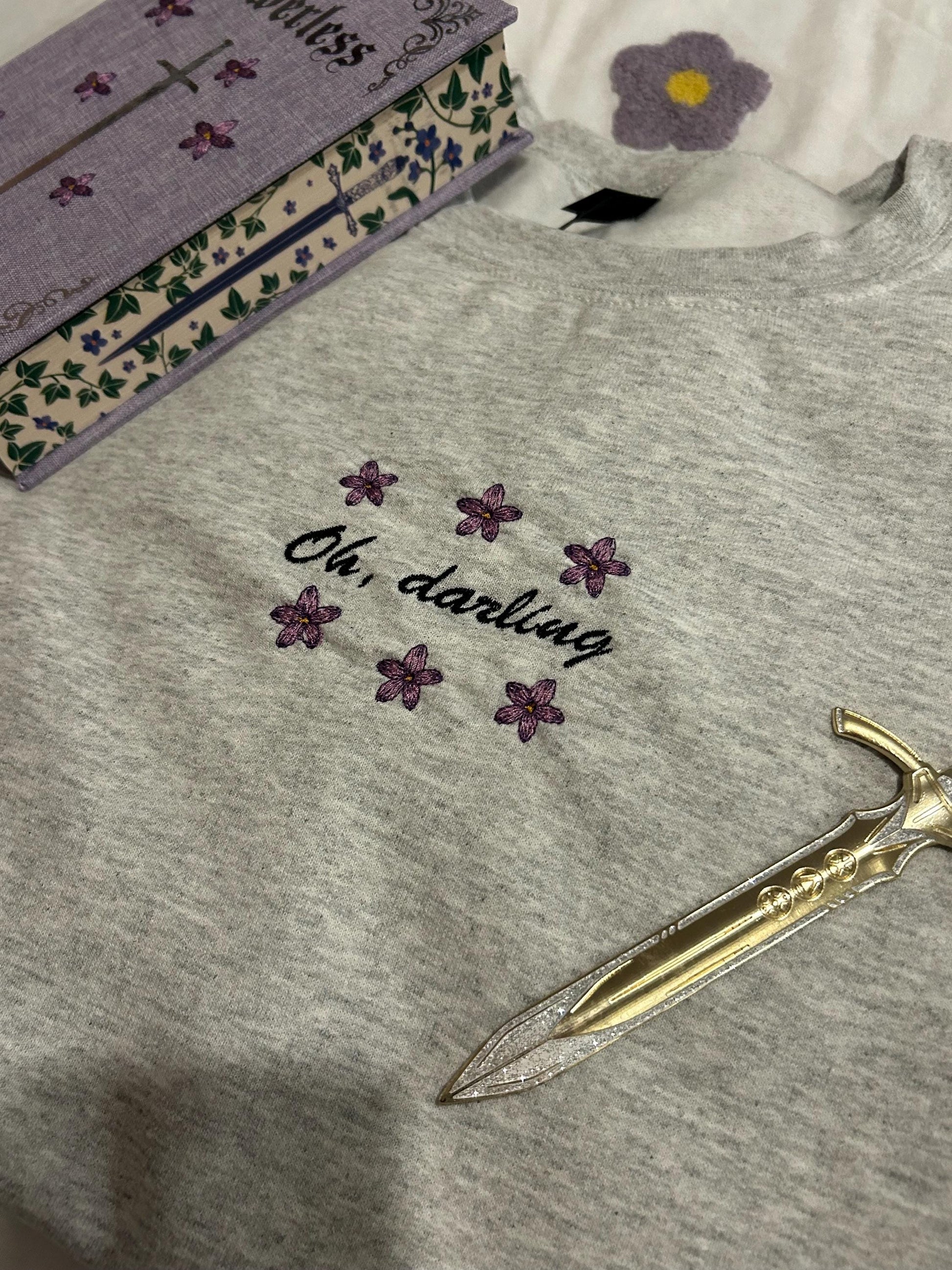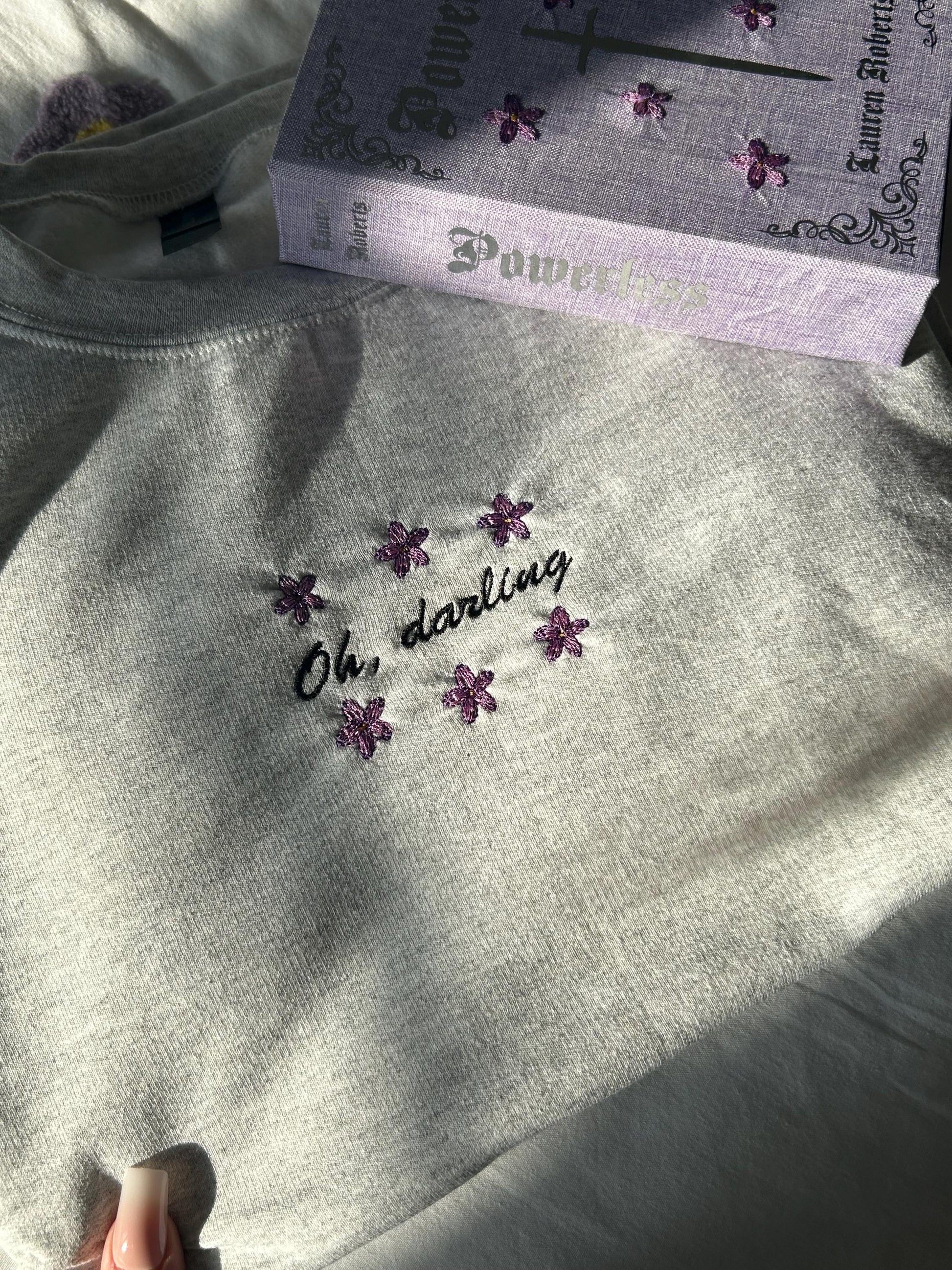 Embroidered Grey Sweatshirt with hand crafted design, perfect for readers.